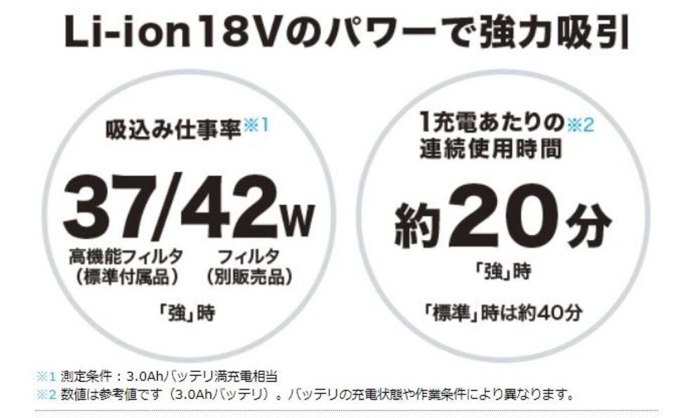 旧基準:30/11W (強/標準)(別販売品のフィルタ使用時)※2 … ※1 測定条件:3.0Ah満充電相当、※2 測定条件:3.0Ah定格電圧相当