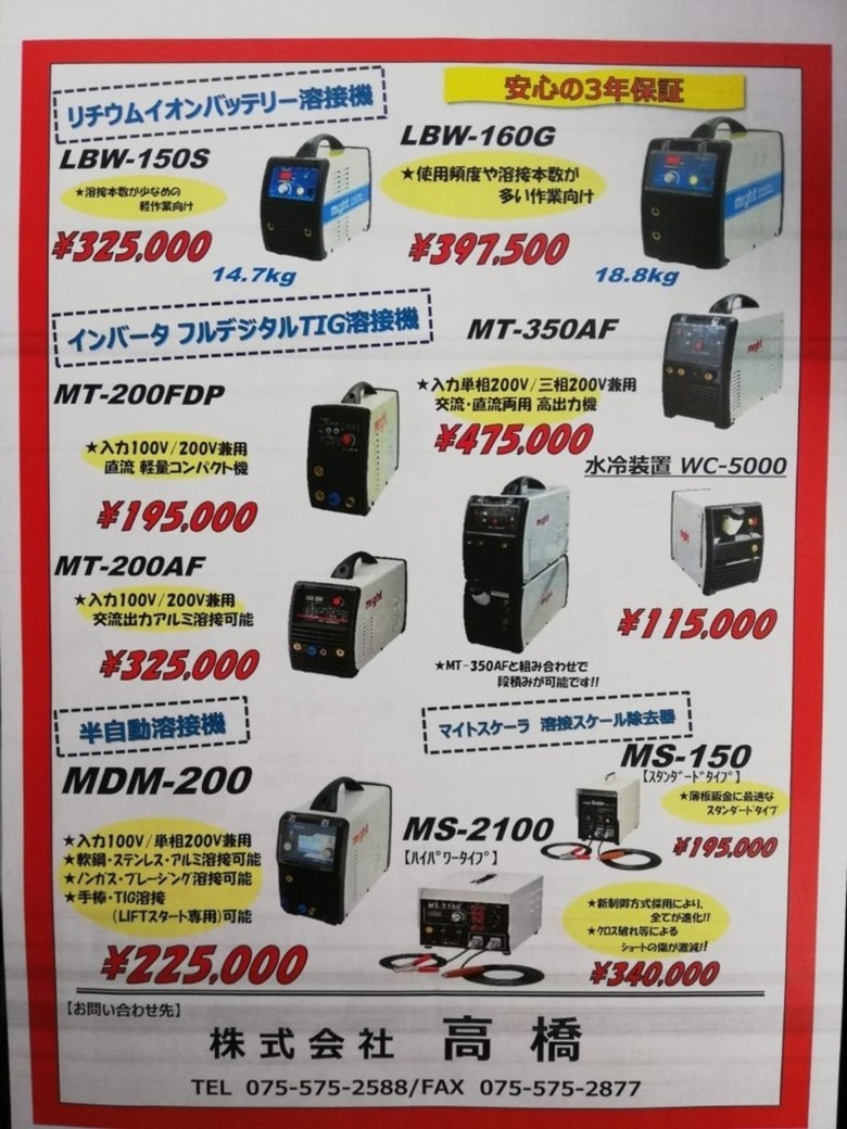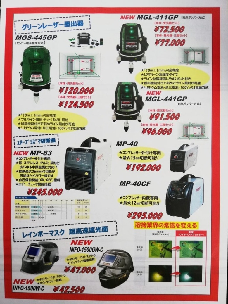 2019/11/18 お知らせ マイト工業 人気のTIG溶接機 レーザー プラズマ等 好評販売中! マイト工業 人気のTIG溶接機 レーザー プラズマ 溶接遮光面 マイトスケーラー 大変お求めやすい価格にて好評販売中です。 この機会にぜひお求めください。 価格、納期のお問い合わせは担当営業マン、問い合わせページよりお願いします。 更新情報一覧へ戻る