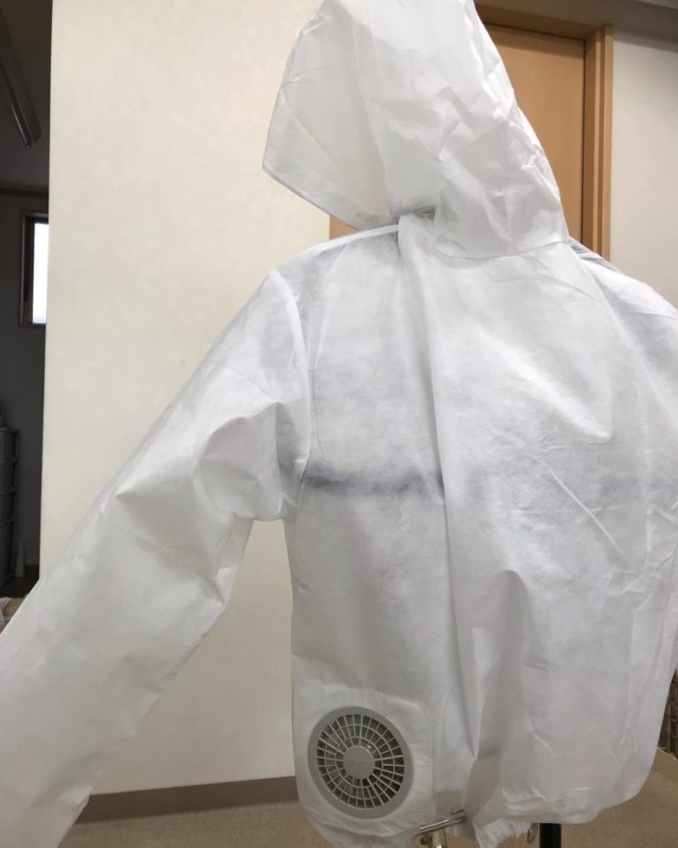 株式会社空調服のファンを取付け可能なフィルムラミネート製作業衣です。
