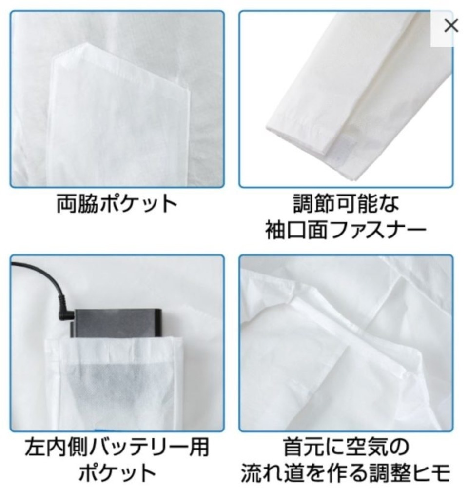 フードヒモ入/袖口面ファスナー留め/裾ゴム入/前ファスナー付/左右ポケット付/ファン取付箇所2ヶ所(背面)/バッテリー用ポケット(内側)